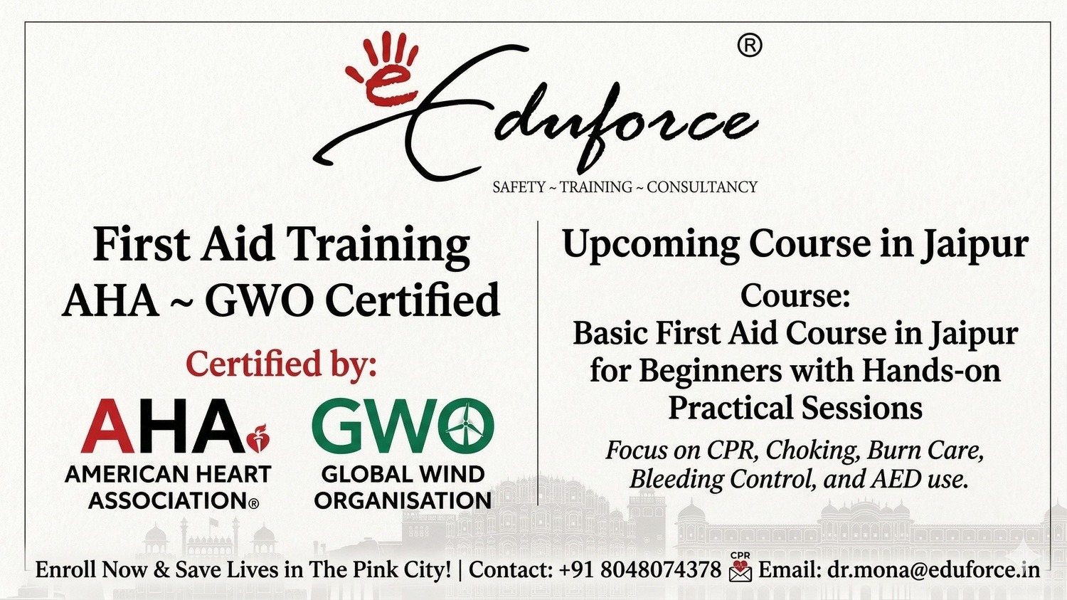 Eduforce basic first aid course in Jaipur city centerFirst aid certification center near Vaishali Nagar JaipurHands-on first aid classes near Malviya Nagar JaipurBasic first aid workshop in C-Scheme Jaipur with practicalsFirst aid training near Mansarovar Jaipur for beginnersPrivate first aid coaching for beginners in Jaipur RajasthanMost recognized first aid certificate for beginners in JaipurShort term first aid certification for beginners JaipurReviews of basic first aid courses for beginners in JaipurAccredited first aid courses with practical sessions in JaipurComparison of first aid course fees in Jaipur for beginnersBenefits of AHA certified first aid course for Jaipur studentsWhy choose hands-on first aid training over online coursesEduforce vs other first aid training providers in JaipurTop rated first aid training centers in Jaipur for beginnersProfessional first aid trainers for beginners in JaipurHands-on AED training for beginners in Jaipur cityStep-by-step first aid training for beginners in JaipurFirst aid training with real-life scenario simulations JaipurFast track first aid certification for beginners in JaipurBasic first aid course to handle emergency at home JaipurImprove workplace safety with first aid training JaipurLearn life-saving skills in Jaipur with hands-on trainingWhere to learn CPR and first aid in Jaipur with practicalsHow to get first aid certified in Jaipur for beginnersHands-on first aid sessions for airport staff in JaipurFirst aid course for factory supervisors in JaipurPractical first aid training for mall security staff JaipurBasic first aid for childcare providers in Jaipur cityFirst aid for trekking and adventure guides in JaipurEmergency response training for Jaipur corporate officesFirst aid training for hotel staff in Jaipur with practicalsWind energy sector first aid training GWO JaipurConstruction site first aid training for beginners JaipurBasic first aid course for industrial workers in JaipurOne day first aid workshop in Jaipur with hands-on sessionsGWO certified basic first aid training for beginners JaipurPractical first aid training for fitness trainers in JaipurHands-on first aid training for school teachers in JaipurFirst aid certification for home makers in Jaipur with practicalsBasic life support and first aid course for Jaipur beginnersCorporate first aid training for beginners in Jaipur RajasthanEduforce first aid training in Jaipur for non-medical studentsWeekend first aid training for beginners with hands-on practice JaipurAffordable basic first aid certification for beginners JaipurComprehensive first aid and CPR course for Jaipur residentsBeginner-friendly first aid workshop with practical sessions JaipurAHA certified first aid course for beginners in JaipurBest hands-on practical first aid training in JaipurCertified Basic First Aid Course in Jaipur for Beginners