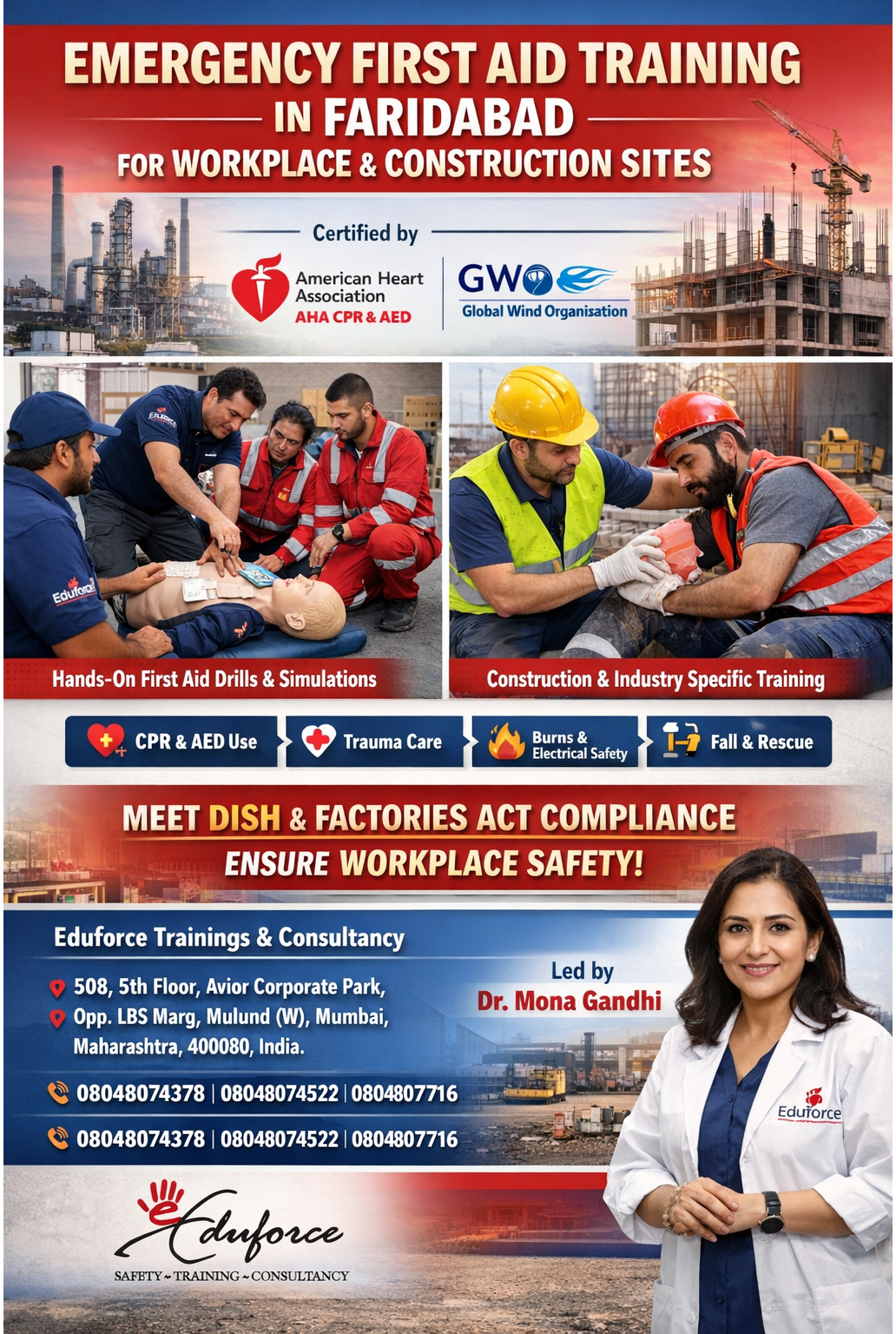 Certified first aid training with Dr. Mona Gandhi FaridabadBasic Life Support (BLS) for non-medical staff FaridabadMass casualty incident management training FaridabadFirst aid training for security personnel in Faridabad corporate parksPediatric first aid training for schools and crèches FaridabadEmergency evacuation and first aid coordination FaridabadFirst aid for respiratory emergencies in Faridabad chemical unitsBurn management and emergency first aid for foundry workersAutomated External Defibrillator (AED) practical demo FaridabadAdvanced bleeding control training for industrial accidents FaridabadCompliance training for HR managers in Faridabad industrial zonesOccupational health and safety first aid training FaridabadEHS compliant emergency response training FaridabadLegal mandates for first aid training in Haryana workplacesFirst aid box training and management for Faridabad companiesWorkplace safety audit preparation and first aid FaridabadGovernment recognized first aid certification for professionals HaryanaCertified first aider requirements for Faridabad industriesFactories Act 1948 compliant first aid course FaridabadDISH approved first aid training for factories in FaridabadIndustrial safety and first aid for Faridabad garment exportersFirst aid training for automobile industry workers FaridabadOn-site emergency first aid for IMT Faridabad factoriesFirst aid for warehouse and logistics staff FaridabadWorkplace ergonomics and injury prevention training FaridabadMachine entanglement emergency response training FaridabadFirst aid for chemical burns in Faridabad industrial plantsCorporate first aid and CPR training for Faridabad officesWorkplace first aid for factory supervisors in Sector 24 FaridabadIndustrial first aid training for manufacturing units FaridabadSite-specific first aid protocols for Faridabad buildersHeatstroke and dehydration prevention training for site workersElectrical shock first aid for construction engineers FaridabadManaging crush injuries on construction sites training FaridabadConstruction safety officer first aid certification FaridabadScaffolding accident emergency response training FaridabadFirst aid for high-rise construction projects in FaridabadFall protection and first aid rescue training FaridabadConstruction site trauma management training FaridabadEmergency first aid training for construction workers in FaridabadHands-on AHA CPR training with manikin simulation FaridabadAccredited GWO training provider in Haryana for site safetyAmerican Heart Association Heartsaver first aid course FaridabadGWO first aid refresher course for technicians in FaridabadInternational standard first aid certification for Faridabad industriesAHA BLS provider course for healthcare professionals FaridabadGlobal Wind Organisation basic safety training Faridabad HaryanaAHA recognized CPR and AED certification FaridabadGWO certified first aid training for wind energy FaridabadAmerican Heart Association first aid training in Faridabad