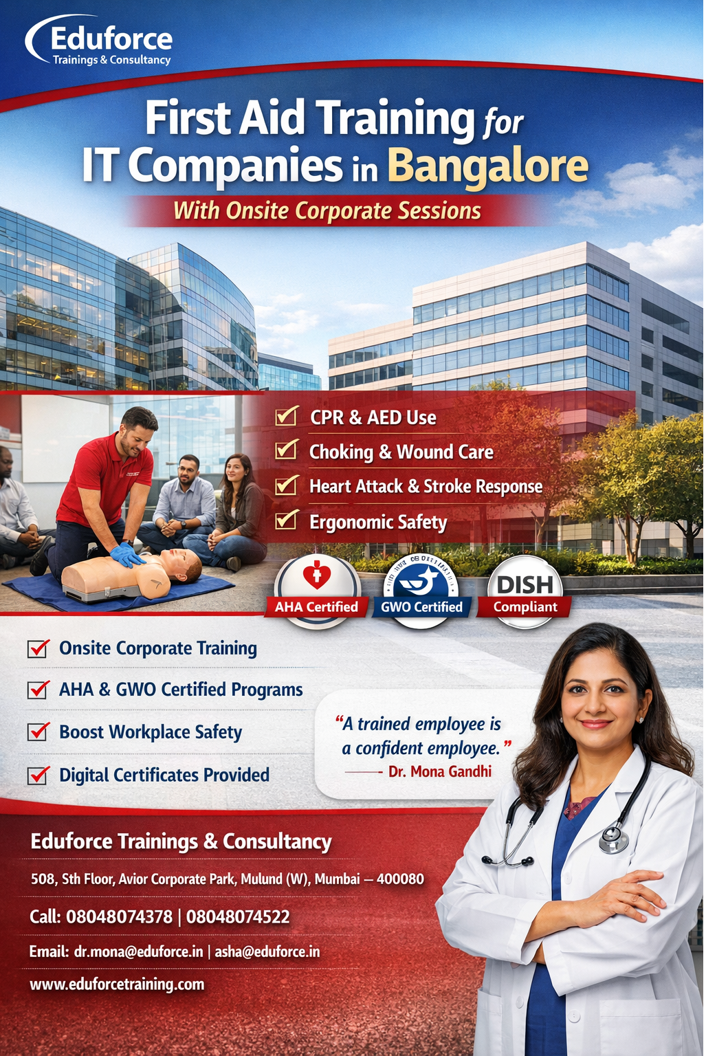 Eduforce onsite first aid training reviews for Bangalore ITOne-day first aid certification for corporate groups in BangaloreFlexible weekend first aid training for Bangalore software firmsComprehensive first aid and fire safety training for Bangalore ITCertified first aid instructors for corporate training in BangaloreComparing online vs onsite first aid training for tech firmsBest first aid training for IT companies with onsite sessionsCorporate first aid training packages for 100+ employeesCost of onsite first aid training for IT companies in BangaloreTop rated corporate first aid training agencies in BangaloreTailored first aid modules for IT office environmentsReducing workplace medical risks with onsite first aid sessionsLife-saving skills training for Bangalore corporate professionalsWorkplace injury management training for IT HR departmentsFirst aid training for night shift IT employees in BangaloreHands-on first aid drills for corporate employees in BangaloreEmergency AED training for software parks in BangaloreFirst aid for cardiac arrest training for Bangalore corporate officesBenefits of onsite first aid training for sedentary IT workersHow to organize onsite first aid training for large IT teamsProfessional first aid certification for corporate health and safetyAccredited onsite CPR and AED training for Bangalore officesValid first aid certification for IT company safety auditsOSHA aligned corporate first aid training BangaloreWorkplace safety compliance first aid courses for HR managersInternational standard first aid training for IT exports in BangaloreAmerican Heart Association CPR certification for Bangalore corporatesDISH compliant onsite first aid training for Bangalore factoriesGWO certified first aid training for tech engineers in IndiaAHA certified Heartsaver first aid training for IT staff BangaloreIn-office first aid training for corporate teams in BellandurCorporate safety training sessions for MNCs in Bagmane Tech ParkBest first aid training providers for IT companies in Bangalore NorthOnsite medical emergency training for Bangalore BPO employeesWorkplace first aid certification for startups in HSR LayoutEmergency response training for IT offices in IndiranagarFirst aid training for software companies in KoramangalaOnsite first aid workshops for tech parks in Manyata BangaloreCorporate first aid and CPR training Electronic City BangaloreOnsite first aid training for IT companies in Whitefield BangaloreFirst aid certification for tech companies BangaloreCorporate safety compliance BangaloreErgonomic injury prevention BangaloreWorkplace accident management BangaloreOffice-specific first aid modules BangaloreEmergency medical response training BangaloreCertified CPR and BLS training BangaloreEmployee workplace safety BangaloreOnsite corporate first aid sessions BangaloreFirst Aid Training for IT companies Bangalore