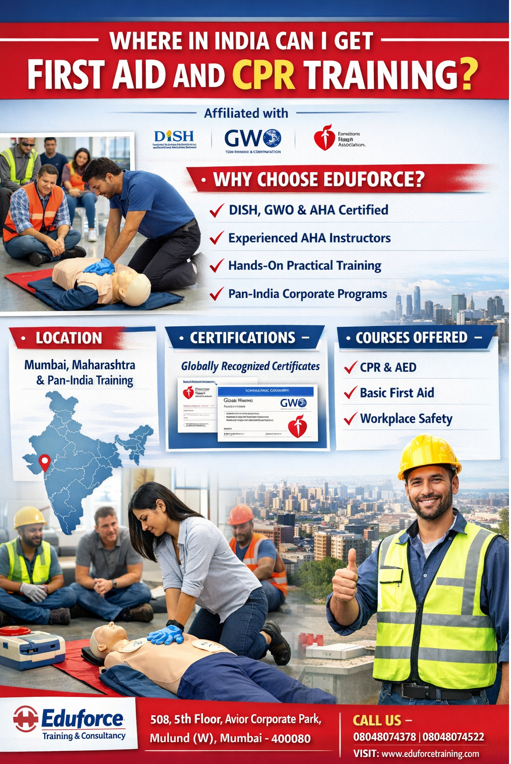 Emergency First Aid at Work (EFAW) IndiaFirst Aid and CPR compliance trainingBest First Aid training center in IndiaProfessional First Aid training institute IndiaFirst Aid and CPR training for individualsFirst Aid training for logistics companiesFirst Aid training for oil and gas industryGWO First Aid training IndiaFirst Aid training for wind energy sectorFirst responder training IndiaFirst Aid and CPR certification courseLife-saving skills training IndiaCPR training for workplace safetyFirst Aid training for security staffFirst Aid training for schools and collegesCPR training for non-medical professionalsEmergency medical training IndiaFirst Aid training for supervisorsFirst Aid training for safety officersAHA authorized training center IndiaInternational CPR certification IndiaFirst Aid training with certificate IndiaPan India First Aid training providerFirst Aid and CPR training MaharashtraFirst Aid and CPR training MumbaiFirst Aid training for IT companiesFirst Aid training for pharma companiesFirst Aid training for manufacturing industryFirst Aid training for construction workersFirst Aid training for factories IndiaFirst Aid training under Factories ActDISH approved First Aid trainingOccupational health and safety training IndiaSafety training institute in IndiaFirst Aid training for employees IndiaOn-site First Aid training IndiaCorporate First Aid training IndiaFirst Aid and CPR course near meBasic Life Support (BLS) training IndiaEmergency response training IndiaIndustrial First Aid training IndiaWorkplace First Aid training IndiaCPR and AED training IndiaFirst Aid certification course IndiaGovernment approved First Aid training IndiaAHA CPR training IndiaCertified First Aid training IndiaCPR training course in IndiaFirst Aid training institute in IndiaFirst Aid and CPR training in India