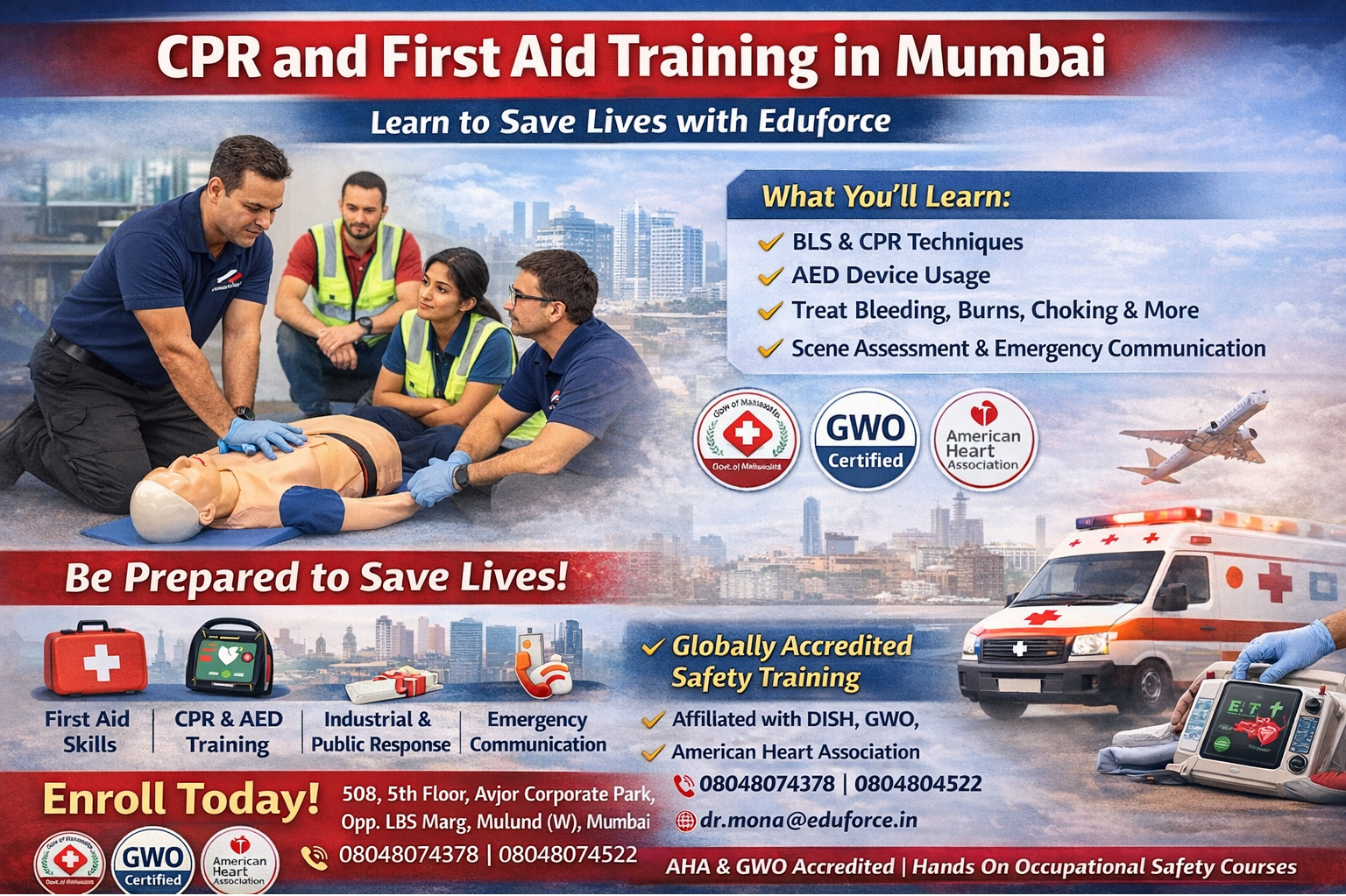 First Aid and workplace safety training by EduforceFirst Aid and CPR training for volunteers and NGOsCPR and First Aid safety compliance training MumbaiFirst Aid training for manufacturing units in MaharashtraFirst Aid and CPR course with global certificationFirst Aid and CPR training center in Mulund MumbaiFirst Aid skills and CPR practice sessions MumbaiEmergency medical response training in MumbaiFirst Aid and CPR course for supervisors and engineersCorporate safety and First Aid solutions in MumbaiFirst Aid and CPR training for healthcare support staffFirst Aid and CPR training provider in MumbaiFirst Aid training for construction sites in MumbaiCertified First Aider course in MumbaiAffordable CPR and First Aid training in MumbaiAdvanced First Aid and CPR training in MumbaiFirst Aid and CPR refresher course in MumbaiIndustrial First Aid and CPR program MaharashtraFirst Aid training for schools and colleges in MumbaiCPR training for office staff in MumbaiFirst Aid and emergency care training in MumbaiIndustrial safety and First Aid training in MumbaiCPR and First Aid workshop for corporates MumbaiFirst Aid training for factories in MaharashtraBest First Aid training institute in MumbaiFirst Aid training with CPR certification MumbaiCPR AED and First Aid course in MumbaiOnsite CPR and First Aid training in MumbaiFirst Aid and CPR course for employees in MumbaiEmergency response training for companies in MumbaiBasic Life Support (BLS) training in MumbaiDISH recognized First Aid training MaharashtraGWO approved First Aid training IndiaAHA certified CPR training in MumbaiGovernment approved First Aid training in MumbaiIndustrial First Aid and CPR course MumbaiWorkplace First Aid training in MumbaiCorporate CPR and First Aid training MumbaiFirst Aid and CPR certification in MumbaiCPR and First Aid Training in MumbaiGWO and AHA Certified First AidOSHA and DISH Safety Training MaharashtraFirst Aid Certification for IndustriesCorporate Emergency Response Training MumbaiAED and Basic Life Support TrainingInternational CPR and First Aid CoursesWorkplace Safety and First Aid CertificationEmergency Response Training MaharashtraCertified First Aid and CPR CoursesCPR and First Aid Training Mumbai