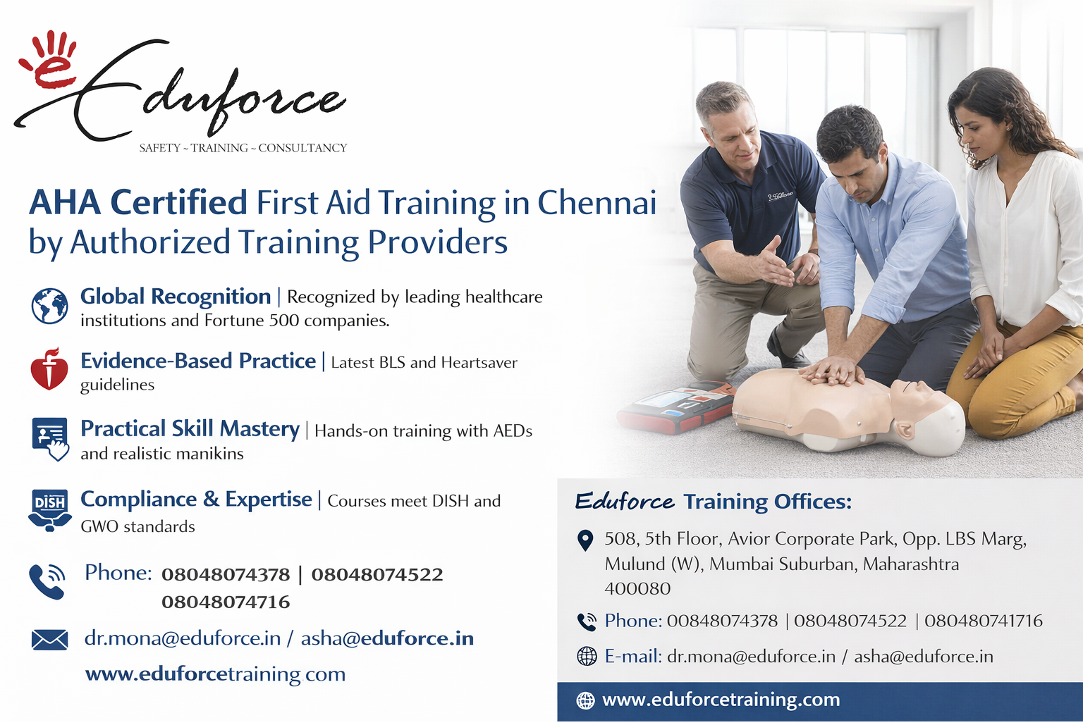 First aid training for offshore and onshore wind farms ChennaiAffordable AHA first aid certification programs in Chennai cityCorporate safety training providers near Avadi and OragadamCertified first aid training in Chennai for manufacturing unitsWeekend first aid and CPR batches for professionals in ChennaiEduforce first aid training contact number ChennaiEmergency medical response training in Ambattur and SriperumbudurFirst aid certification course near Guindy Industrial EstateAuthorized AHA training partners in Tamil Nadu for corporatesEduforce First Aid training reviews and course fees ChennaiBest first aid training institute near OMR and ECR ChennaiFirst aid training for medical emergencies in schools ChennaiSimulation-based first aid training for industrial accidents ChennaiBasic Life Support (BLS) practical sessions in ChennaiFirst aid training for heatstroke and environmental emergencies ChennaiPractical first aid for chemical burns and industrial injuries ChennaiAutomated External Defibrillator (AED) operation training ChennaiHigh-quality chest compression training by AHA experts ChennaiWound management and trauma care training in ChennaiFirst aid training for choking and airway management ChennaiHands-on CPR and AED training with manikins in ChennaiGWO first aid refresher training for Chennai techniciansFirst aid certification for solar and wind power plants ChennaiAdvanced rescue and first aid training for wind turbines ChennaiGWO WINDA registered first aid training centers in ChennaiEduforce GWO certified first aid courses in ChennaiSafety training for renewable energy professionals in ChennaiGWO enhanced first aid training providers in Tamil NaduGWO Basic Safety Training (BST) first aid module ChennaiGWO certified first aid training for wind energy technicians ChennaiAnnual first aid refresher course for industries in ChennaiFirst aid training for construction site supervisors in ChennaiEmergency response team (ERT) training with AHA certification ChennaiOn-site first aid and AED training for Chennai corporate officesFirst aid training for OHSAS compliance in Chennai workplacesIndustrial first aid training in Chennai for safety officersGroup first aid training for corporate employees in ChennaiWorkplace safety first aid certification for factories in ChennaiCorporate first aid and CPR training for IT companies in ChennaiDISH Maharashtra compliant first aid training for Chennai companiesAuthentic American Heart Association first responder training ChennaiAHA certified emergency cardiovascular care training ChennaiOfficial AHA First Aid course completion card providers ChennaiRenew AHA First Aid and CPR certification in ChennaiAHA Heartsaver Pediatric First Aid training Chennai priceHow to get AHA First Aid certification in ChennaiAHA certified BLS and First Aid training for healthcare workers ChennaiBest AHA authorized first aid training center in ChennaiAmerican Heart Association certified training providers in ChennaiAHA Heartsaver First Aid CPR AED course Chennai