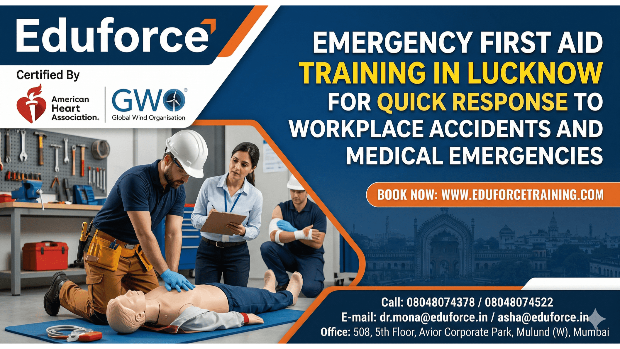 How to book a first aid training session for Lucknow staffHow trained first aiders reduce company liability after accidentsLegal requirements for first aid training in Indian workplacesEssential first aid kit training for office safety wardensTools and equipment needed for workplace first aid responseDesigning a workplace emergency response plan with first aidCost of corporate first aid training programs in LucknowStep-by-step first aid response for common office injuriesBenefits of quick response first aid for workplace medical crisesWhy your office needs emergency first aid training todayOSHA-compliant first aid training for multinational firms in LucknowCompliance-based first aid training for ISO 45001 certificationBLS and ACLS certification for workplace medical respondersAdvanced first aid training for high-risk industrial environmentsGWO first aid training for renewable energy sector employeesInternationally recognized first aid certificates for Lucknow workersComparison of AHA vs Red Cross first aid for corporate safetyValid GWO First Aid refresher course for offshore techniciansAmerican Heart Association first aid certification for Lucknow businessesGWO Basic Safety Training (BST) First Aid for wind energy LucknowMental health first aid for workplace stress and crisesEmergency first aid for stroke symptoms in older employeesSeizure management and first aid response in the officeHandling severe allergic reactions (Anaphylaxis) at workBasic life support for non-medical professionals in corporate hubsChoking relief and airway obstruction training for employeesHow to use an AED during a workplace medical emergencyFirst aid for diabetic emergencies and fainting at the officeEmergency response for heatstroke in outdoor workplaces LucknowRecognizing signs of cardiac arrest at work first aid trainingEssential first aid skills for warehouse safety teamsFirst aid procedures for crush injuries in manufacturing plantsReducing LTI (Lost Time Injury) through employee first aid trainingWorkplace trauma management training for safety officersEmergency first aid for heavy machinery accidents in factoriesHandling chemical burns in the workplace first aid guideQuick response protocols for fall-related injuries at workManaging electrical shock emergencies in the workplace trainingFirst aid training for preventing fatalities in industrial accidentsHow to manage workplace accidents with quick first aid responseCorporate wellness and safety training programs in LucknowFirst aid training for school staff and teachers in LucknowAHA certified Heartsaver First Aid CPR AED course in LucknowEmergency medical response training for Lucknow construction sitesTop-rated first aid instructors for Lucknow industrial areasProfessional CPR and AED training classes in Lucknow cityOn-site emergency first aid training for factories in LucknowWorkplace safety and first aid certification Lucknow near meCertified AHA BLS training providers in Lucknow Uttar PradeshBest first aid training center in Lucknow for corporate offices