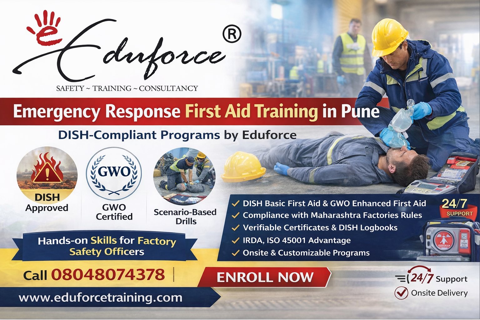 AED Defibrillator Training PuneChemical Burn First Aid Training PuneISO 45001 First Aid Compliance PuneFirst Aid Kit Training MaharashtraSafety Officer First Aid Certification PuneCardiac Arrest Response Courses PuneWind Turbine First Aid GWO PuneHands-on Emergency First Aid Workshops PuneFirst Aid Workshops Magarpatta PuneIndustrial Safety First Aid Hadapsar PuneEmergency Response Training Bhosari PuneFirst Aid and CPR Classes Near Pimpri PuneFirst Aid Courses Talegaon PuneWorkplace Emergency Response Training PuneGWO Training Wakad PuneFirst Aid Training for Safety Officers PuneWeekend First Aid Training in Hinjewadi PuneFactory First Aid Certification Courses PuneAffordable First Aid Courses for Workers PuneEmergency Response Team ERT Training PuneFirst Aid Training Chakan MIDC PuneGWO Basic First Aid Refresher PuneDISH First Aid Certification Pimpri ChinchwadCPR Classes Ranjangaon PuneCorporate First Aid Training Programs PuneFactory First Aid Classes Satara Road PuneEmergency Training Hinjewadi IT Park PuneBLS ACLS Training Institutes in PuneBasic Life Support BLS PuneDISH and GWO certified first aid courses PuneAHA Certified CPR Training in Chakan PunePune industrial safety training coursesGWO First Aid Training for Wind Energy PuneIndustrial First Aid Training PuneCPR Emergency Response Training PuneDISH Approved First Aid PuneEmergency Response First Aid Training in PuneFirst Aid Training PuneGWO First Aid Certification PuneOnsite First Aid Training Companies in PuneDISH Compliant First Aid Training Pune MIDCAHA First Aid Training PuneFactory safety first aid certification PuneGWO emergency response training PuneAdvanced First Aid PuneEmergency First Aid Courses PuneDISH compliant first aid programs PuneFirst aid training for industrial workers PuneBest Emergency Response First Aid Training in PuneEmergency Response First Aid Training Pune