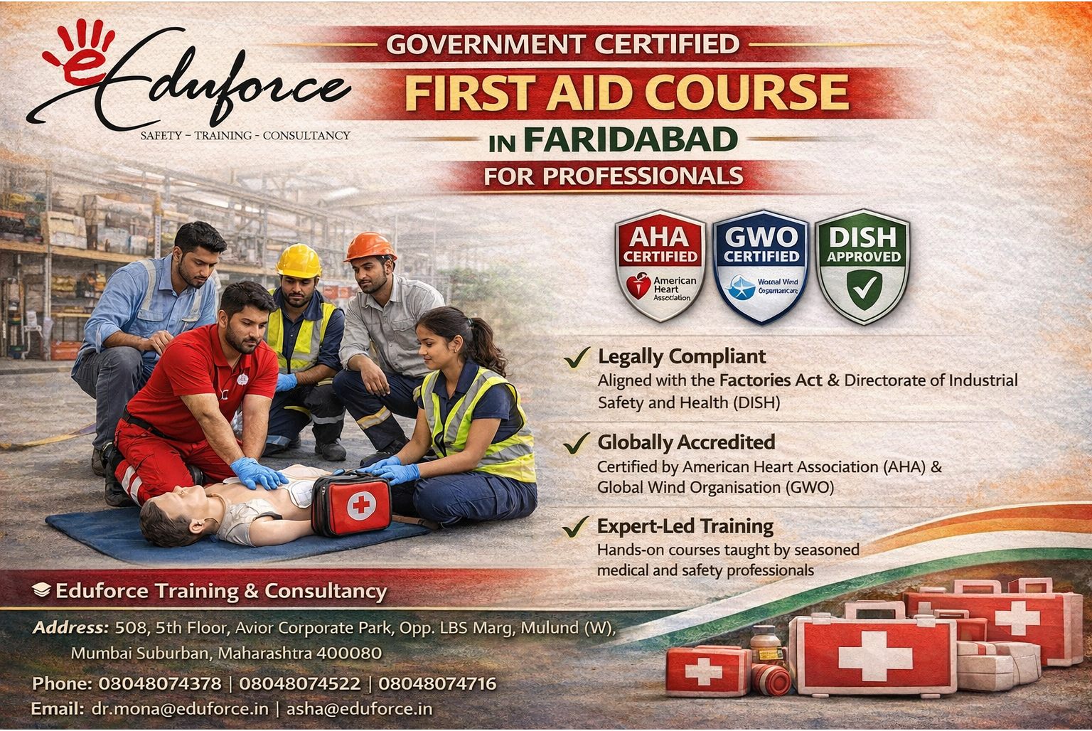 Best institute for practical first aid simulation training FaridabadAdvanced life support training for non-medical professionals FaridabadImmediate first aid certification for job seekers in FaridabadEduforce first aid training reviews and course fees FaridabadFirst aid training near me for industrial safety officersPractical hands-on first aid training center in FaridabadAffordable first aid training with government certification FaridabadOn-site corporate first aid training services in FaridabadWeekend first aid certification classes for professionals Faridabad1-day government certified first aid course in FaridabadCertified first aider course for event management professionalsFirst aid training for school bus drivers and attendants FaridabadProfessional first aid skills for corporate facility managersBest first aid course for personal trainers with certificationSafety training for security officers with government certificateFirst aid and CPR certification for daycare providers FaridabadEmergency first aid training for hospitality and hotel staffCertified first aid course for school teachers in FaridabadBest first aid training for fitness trainers and gym staff FaridabadFirst aid certification for cabin crew aspirants in FaridabadHigh-altitude first aid training for wind technicians HaryanaFirst aid certification for GWO WINDA registration FaridabadAdvanced GWO safety training for solar and wind farms FaridabadGWO compliant first aid for offshore and onshore techniciansWind energy industry safety training certification FaridabadAccredited GWO first aid training provider in North IndiaGWO BST first aid module for renewable energy professionalsFirst aid training for wind turbine technicians in FaridabadGlobal Wind Organisation first aid refresher course FaridabadGWO certified basic safety training (BST) first aid FaridabadAHA instructor-led first aid workshops in FaridabadGlobal standard first aid training for nursing staff FaridabadBest CPR training with AHA completion card FaridabadAHA approved first aid training for dental professionals FaridabadUS-standard first aid and CPR certification in FaridabadAHA BLS and ACLS training for healthcare providers FaridabadInternationally recognized first aid certificate for professionals FaridabadBest AHA CPR and AED certification for doctors in FaridabadAmerican Heart Association Heartsaver first aid FaridabadAHA certified BLS training center in FaridabadOfficial first aid training provider for Faridabad manufacturing unitsCompliance-based first aid certification for Faridabad corporatesCertified emergency response team (ERT) training in FaridabadDISH Haryana first aid training requirements for 2026Workplace safety training with government certification FaridabadGovernment certified first aider course for Haryana businessesMandatory first aid training for Faridabad industrial workersBest first aid certification for HR managers in FaridabadHaryana Factories Act compliant first aid course for industriesDISH approved first aid training for factories in Faridabad