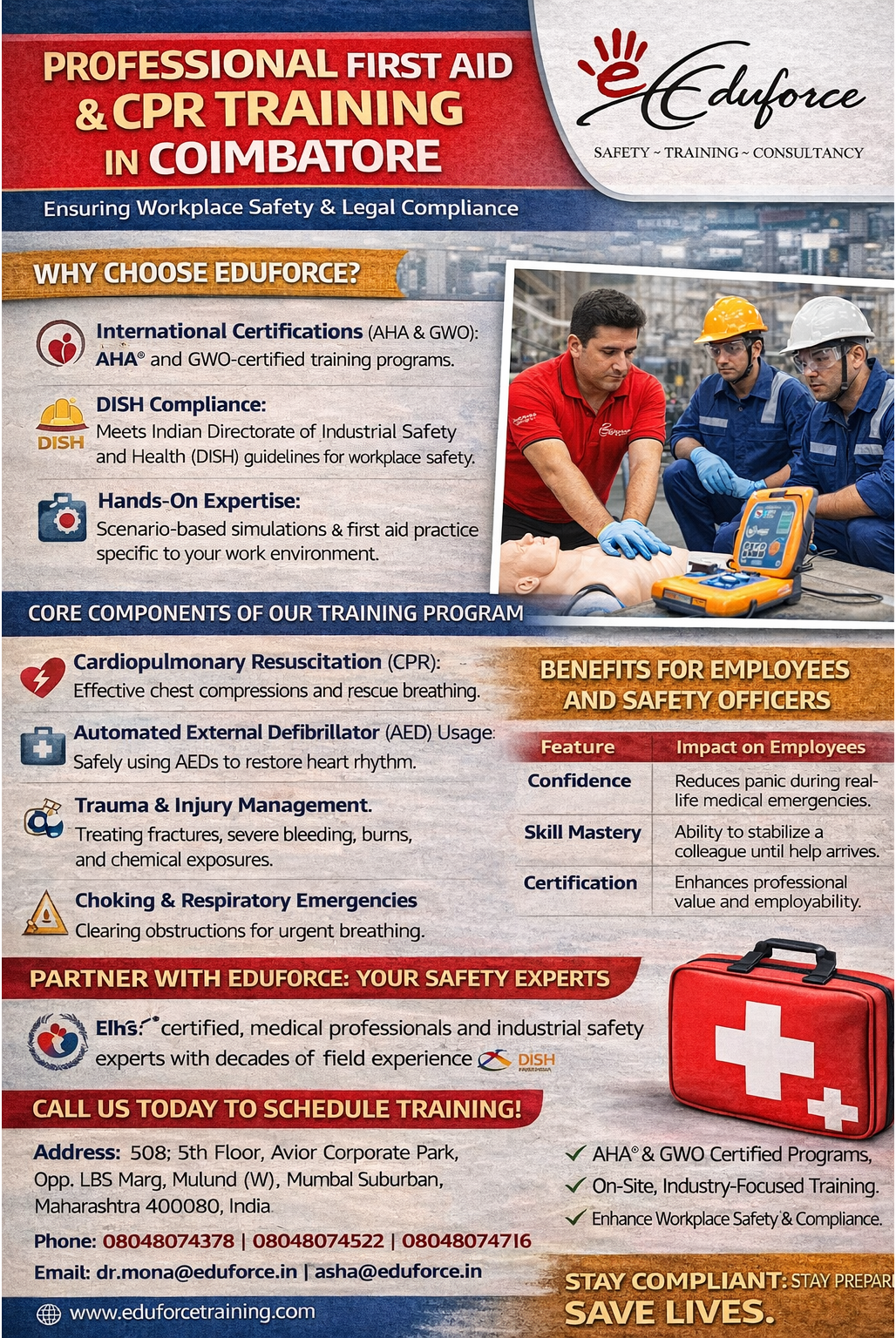 Comprehensive emergency coordinator training for Coimbatore safety leadsFirst aid training for logistics and transport employees in CoimbatoreOxygen administration training for emergency responders in CoimbatoreBloodborne pathogens training for Coimbatore safety personnelMass casualty incident management for safety officers in CoimbatoreAutomated External Defibrillator (AED) training for Coimbatore gym staffFirst aid for burns and electrical shocks for Coimbatore electriciansChoking and airway management workshops for Coimbatore hospitality staffPediatric first aid training for daycare employees in CoimbatoreAdvanced trauma care training for industrial safety officers in CoimbatoreFirst aid kits and training packages for Coimbatore startupsMental health first aid for HR and safety officers in CoimbatoreImproving emergency response time with on-site CPR training CoimbatoreHandling machinery accidents: First aid training for Coimbatore workersFirst aid training for heatstroke and dehydration in Coimbatore factoriesTraining employees to handle cardiac arrest in Coimbatore workplacesHands-on AED training for corporate safety officers in CoimbatoreCost-effective first aid training for small businesses in CoimbatoreWhy safety officers in Coimbatore need professional CPR certificationReducing workplace fatalities with CPR training for Coimbatore employeesProfessional life-saving skills workshops for Coimbatore warehouse staffImmediate first aid certification for safety officers in MettupalayamGroup CPR training discounts for Coimbatore SME employeesMobile first aid training units for industrial sites in CoimbatoreFirst aid and fire safety training for schools and colleges in CoimbatoreEmergency medical response training for factories in Kurichi Industrial EstateWeekend first aid certification classes for working professionals in CoimbatoreCorporate CPR training workshops for employees in Pollachi and CoimbatoreBest first aid training institutes for safety officers in PeelameduOn-site professional first aid and CPR training for Coimbatore companiesProfessional first aid course for lead safety auditors in CoimbatoreAccredited first aid training for ISO 45001 compliance in CoimbatoreAnnual first aid refresher courses for safety officers in CoimbatoreCertified CPR and AED training for workplace safety teams CoimbatoreValidating first aid certificates for safety audits in Coimbatore industriesGWO BST First Aid module training providers in CoimbatoreInternational standard first aid certification for Coimbatore corporate officesStatutory first aid training for safety officers under Factories Act CoimbatoreHow to get AHA CPR certification for employees in CoimbatoreDISH approved first aid training for factories in CoimbatoreHigh-altitude first aid training for wind energy professionals CoimbatoreChemical spill first aid training for safety officers in CoimbatoreWorkplace injury management training for manufacturing units in CoimbatoreBasic life support (BLS) training for IT park employees in SaravanampattiSpecialized CPR training for electrical department safety officers in CoimbatoreConstruction site first aid and safety officer training CoimbatoreEmergency response training for engineering industry employees in CoimbatoreFirst aid training for textile mill workers in Coimbatore industrial beltAHA approved BLS and CPR certification for healthcare staff in CoimbatoreGWO certified first aid training for wind turbine technicians in Coimbatore
